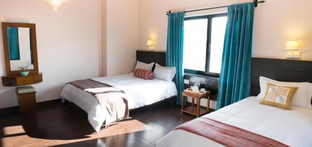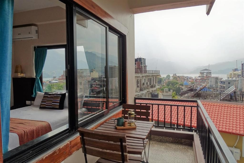 An eco-friendly boutique hotel in the heart of Lakeside Hotel Karuna is a small, family-run boutique hotel in central Lakeside, just a short walk from Phewa Lake and Pokhara’s favorite cafés, restaurants, and shops. We offer 24 clean, bright, and comfortable rooms with views of the Pokhara valley, Lakeside community, World Peace Pagoda, and Phewa Lake. Deluxe rooms include private balconies, some with views of the Annapurna and Machapuchare Mountains. Family rooms with bunk beds are ideal for those traveling with children. Breakfast — included with every stay Breakfast at Karuna is something we are especially proud of. Our vegetarian buffet blends Nepali and international flavors: fresh fruit, house-made muesli, yogurt, sprouts, hummus, seasonal vegetables, eggs made to order, local tarkari, fresh juices, and our much-loved Sel Roti special on Saturdays. We also offer gluten-free and dairy-free options. We serve hand-brewed, locally grown organic pour-over coffee alongside a curated selection of local teas and herbal infusions. Mornings here are relaxed, nourishing, and a beautiful way to begin your day in Pokhara. Rooftop garden & quiet spaces Our courtyard garden offers a calm place to unwind, while sunrise and sunset are best enjoyed from the rooftop. Surrounded by plants and prayer flags, the rooftop provides shaded seating, mountain views, and space for yoga or quiet reflection above the city. Located just off the main road, Karuna offers a central yet peaceful base. Appy Hour @ Karuna Each afternoon from 4–6pm, guests gather in our lobby lounge for Appy Hour — a relaxed chance to enjoy local street-food inspired bites like pani puri and dahi puri, prepared fresh and tailored to your spice preference. It’s a social space to connect, and 100% of profits are donated to a trusted local charity. Owned with heart Hotel Karuna is owned and operated by a cross-cultural family — Nepalese Nim Magar and his Canadian wife Kelly, affectionately known as “Bhauju.” We love sharing local insight and helping guests make the most of their time — whether trekking, adventuring, or simply slowing down. We look forward to welcoming you.